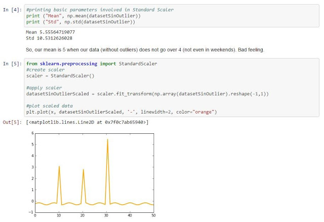 You may not see it in the plot (but you can see it in the output), but this scaler introduced negative numbers and did not limit the data to the range [0, 1]. (OK, I quit). There are others methods to normalize your data (based on PCA, taking into account possible physical boundaries, etc), but now you know how to evaluate whether your algorithm is going to influence your data negatively.