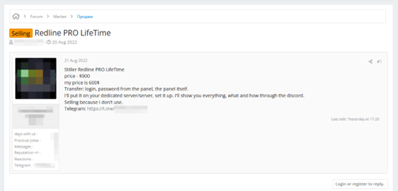 Threat actors also have the possibility to add systems to their botnets by selling or renting specific malware on Dark and Deep Web forums and markets. For example, below, we can see a sale of Redline for life (and at a discount of 300 euros!).