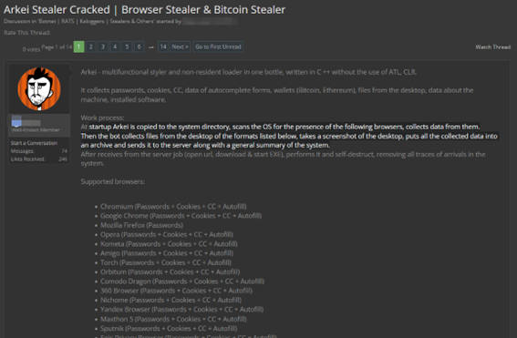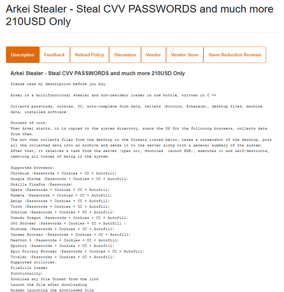 In this other recent post from a well-known Dark Web marketplace, the Arkei malware is offered for sale for $210: